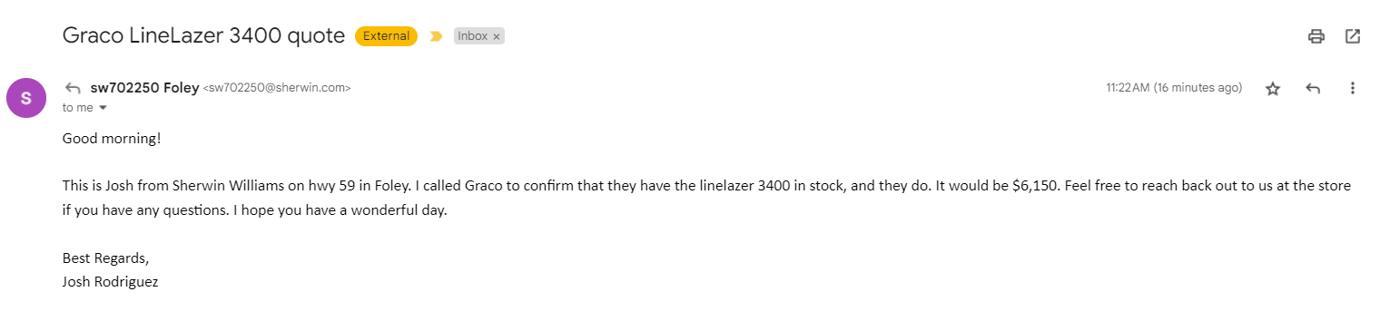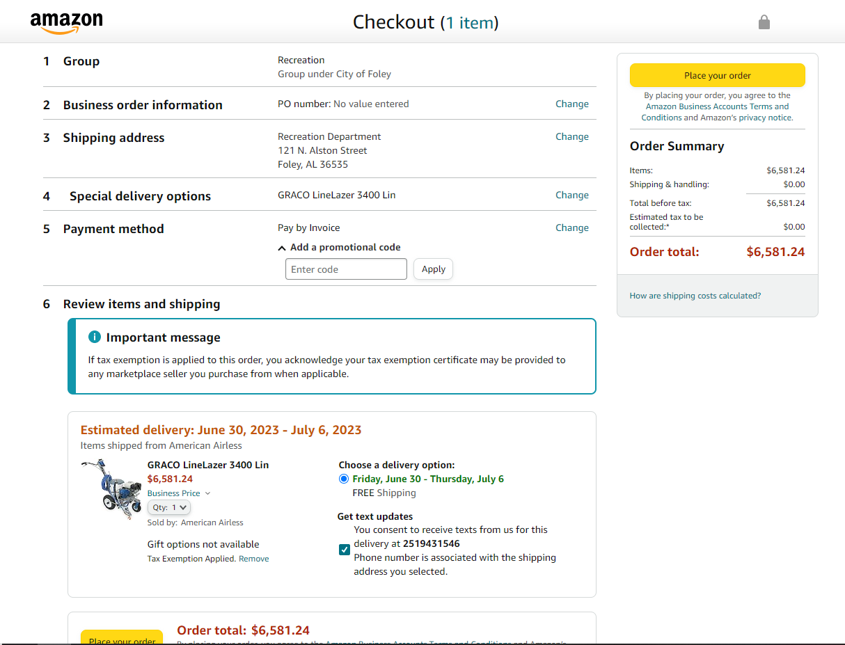 The Parks & Recreation Department requests permission to make an unplanned capital purchase of a Graco Linelazer 3400 ball field painter in the amount of $6,150 from Sherwin Williams under account 100-5030-5100. This painter is needed to eventually replace an existing painter which is currently over 20 years old. The department currently has limited funds left in this account and is asking to increase the budget by $3,400 to cover the total amount for the painter.